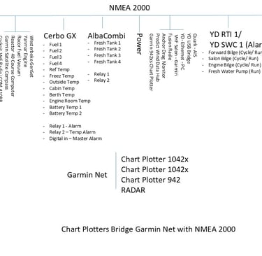 The Garmin Ecosystem also has an TCP/ IP network that allows the 3 chart plotters and the RADAR & Camera to talk directly. The chart plotters also provide the bridge between the Garmin Networked devices and the rest of the electronics found on the NMEA 2000 backbone. The Garmin Chart Plotters have APPs that allow us to monitor data, control systems as well as track our progress and program desired courses. These are the heart of our electronics on the boat.