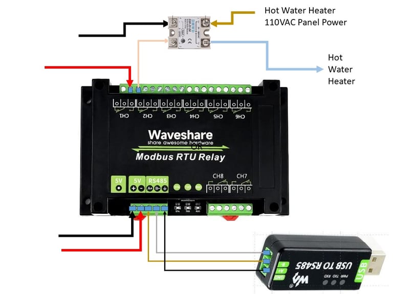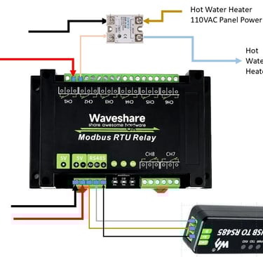 Finally, if this was all not enough, we plan to be able to turn our hot water heater on and off by a combination of the battery state of charge and the solar input. This requires some specialized programing via a system called Node Red and external relays. The picture to the right shows the devices we plan to use for this function. This is an experiment and we will post the implementation details here once we have it all working.