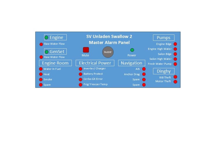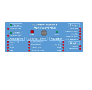 Most modern boats have multiple systems with audible alarms. The issue is that the standard alarm is a buzzer. Well once a buzzer goes off you have to find which one it is and then determine why it's going off. In the old boat, in its original configuration, there were at least 5 different alarms sounded the same. It drove us insane and we were determined to come up with a better mousetrap. The first iteration was based on a Yacht Devices Alarm Button. This sounded like a great idea as we could define a DIFFERENT sound for each different alarm. This turned out to be just as bad, as we still needed a cheat sheet to match which sound went with what alarm. Still too difficult to deal with when things are going sideways in a gale at 2AM in the morning.