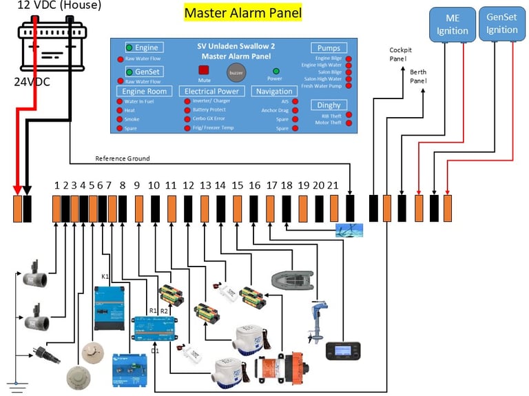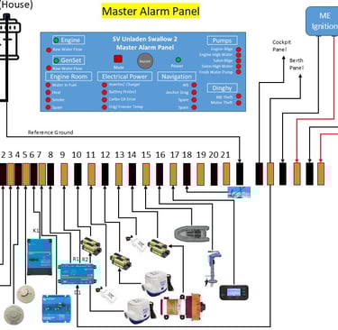 The various electronics devices on the boat with alarm circuits have a relay that is closed to signal an alarm state. These are directly fed into the panel.