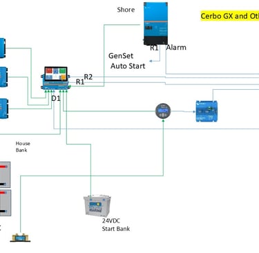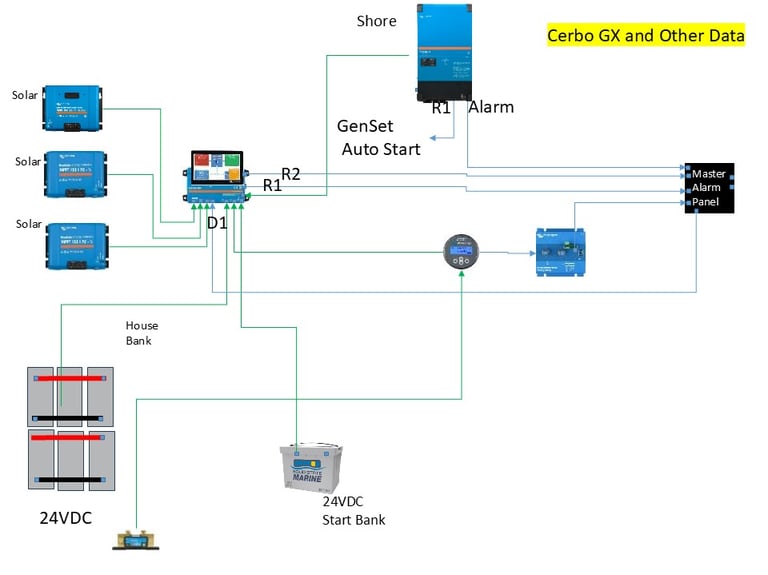 The Picture above shows all of the inputs and outputs we are expecting to implement, while the green lined diagram to the upper right shows the external Victron devices connected to the Cerbo GX