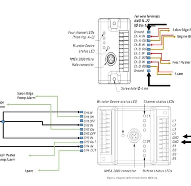Run Time Indicator - This 4 channel device allows us to measure voltage or current on electrical devices wired through this device. This is how we will track the operation of the fresh water and bilge pumps