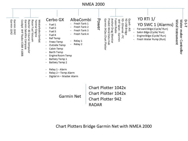 This is the primary network over which most of the boat's electronics interconnect. Our network is more complex than most boats, but we are using it to control and monitor most of the systems on the boat.