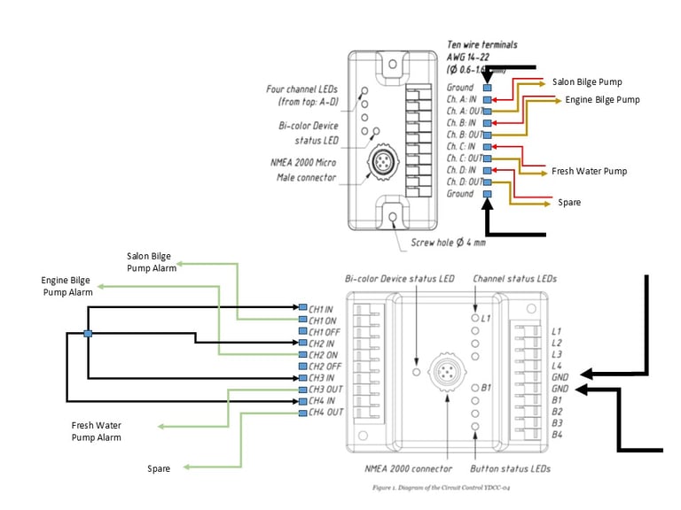 The pumps' electrical circuits are fed through a Yacht Devices Run Time Indicator to monitor both cycle and run time. If a pump is cycling or running long, the Yacht Devices system can then close a relay sending a signal to the alarm panel. The diagram below shows how the circuits are setup to accomplish this. We will add a diagram showing the programming necessary once we complete it.