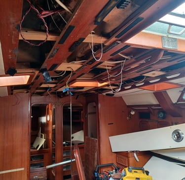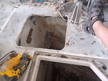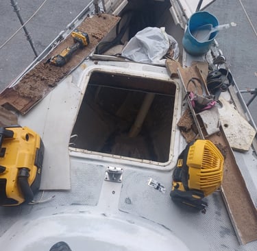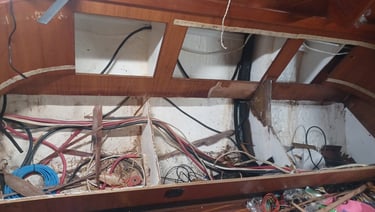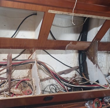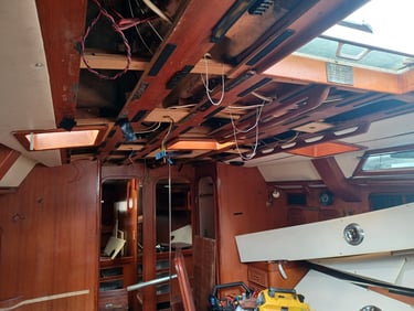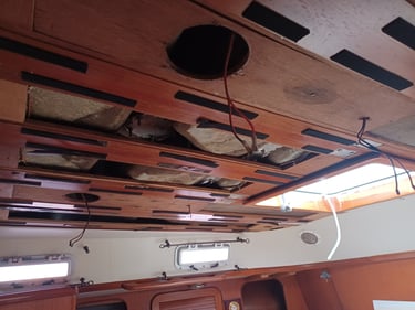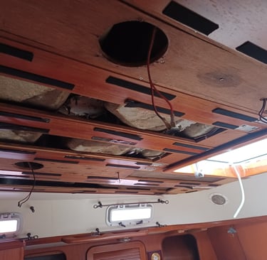 2 Jun - headliner from forward berths removed. Found additional rot around the prisms.