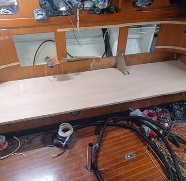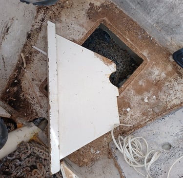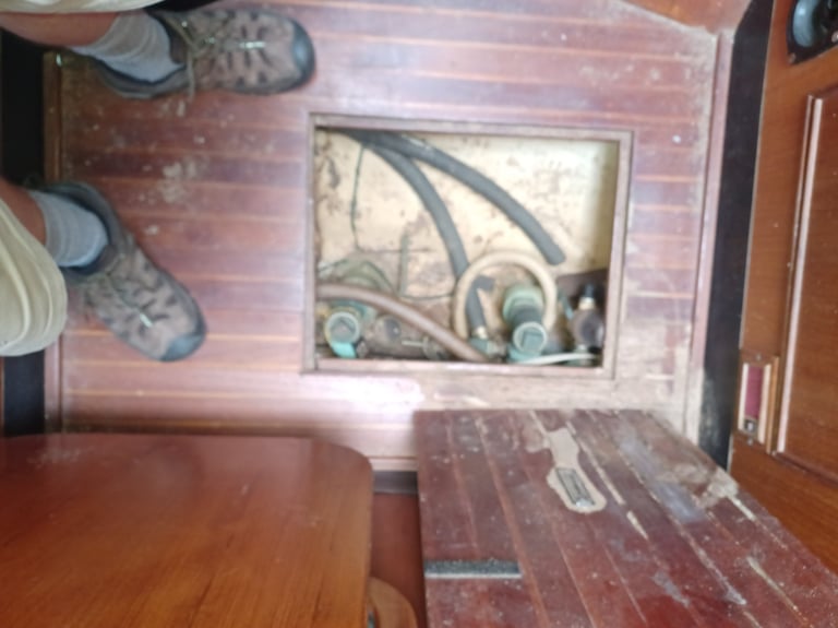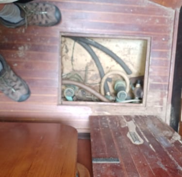 The old battery compartment in the forward PORT berth and the associated "sole" pieces. - the plan is to use this area for the new watermaker and we will redo this space to accommodate the new water maker.