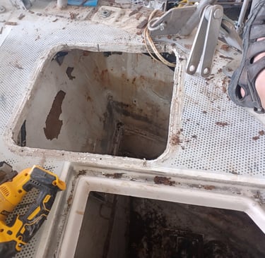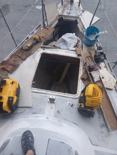 Convert bulkhead between forward berths and locker area to be water tight - (Remove hatches, remove drains at base, seal up) - discovered more rot at the base of the bulkhead - this appears to be an area that was added by a previous owner and the damage had not migrated into the primary bulkhead structure.