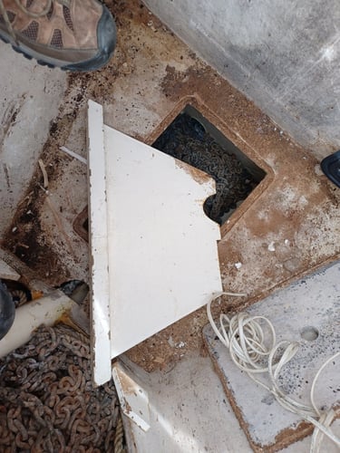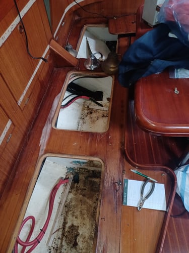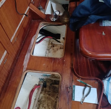 We discovered Termites our first day in the yard as we emptied out compartments - especially the sail locker. We will be replacing the compromised pieces of plywood: