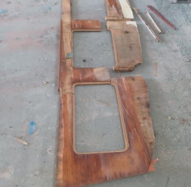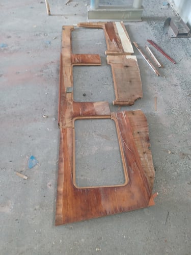 There may be more wood removed, but so far we have removed the floors of 2 of the 3 storage sections (the 1st 2 will be the home for the new batteries) and the bench seat. The lower area of the back rest also has peeling veneer, but we have not decided our approach there yet.