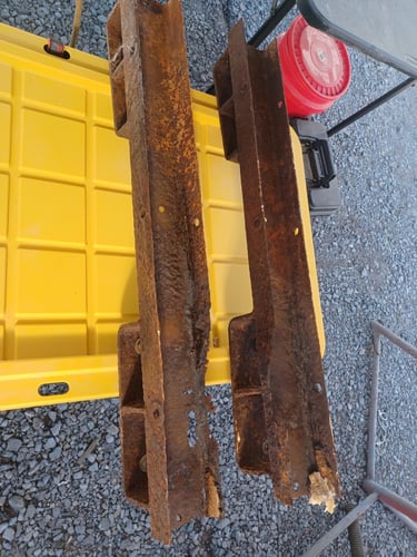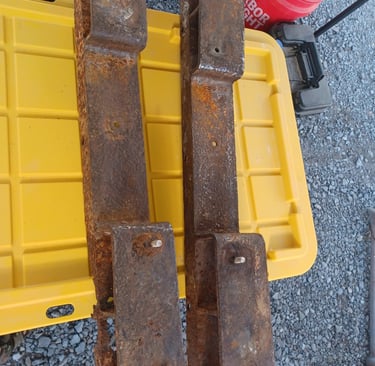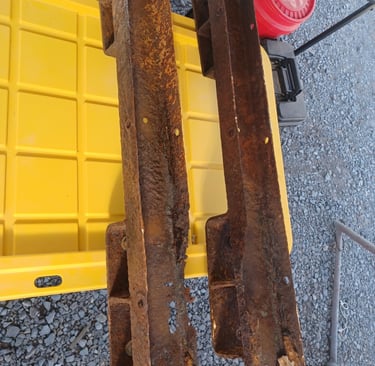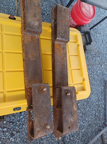 Engine Mounts. I finally decided to take a closer look at the old engine mounts - the one that the original mechanic told me were too difficult to remove - and decided that they were in tough enough shape to try to remove them. 30 minutes later, I had them both out without damaging anything. And yes, they have to be replaced. The images below show them out of the boat with the rust damage clearly visible. It also turns out that the engine mounting studs are in the wrong place for the new motor. The new mount is still being designed, but will likely look similar, but in heavy gage aluminum.