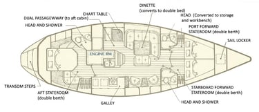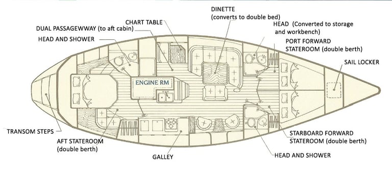 Her layout suits us better than the Beneteau and with her deeper (and heavier) hull she should be more stable and comfortable underway and likely at anchor. She is a Center Cockpit design with allows for a the owner's berth to be a full beam stateroom in the aft area. She was built with 3 heads, although 1 was converted to a store/ workroom.