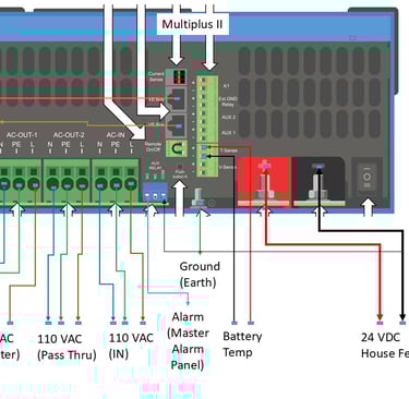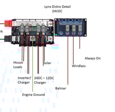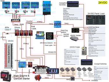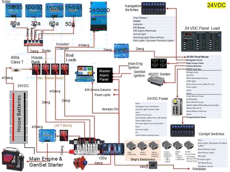 Important Disclaimer - I am not a certified marine electrician. The below was developed with the paid help of several folks who do this for a living. Unless you are actually trained to do this type of design, attempting on your own could result in serious injury or death. The voltages coming through the Solar Controllers will kill you. The amount of power stored in the batteries will easily weld steel if short circuited. Please seek qualified help before designing something like this and if you are unsure of how to install, the university of you tube is full of advice that can kill you or leave you with an unsafe system.